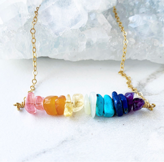 This chakra gemstone necklace includes 7 different types of stones, one for each chakra- pink tourmaline, carnelian, citrine, jade, turquoise, lapis lazuli and amethyst. Stones are strung onto wire, wrapped on each end and attached to a delicate chain.