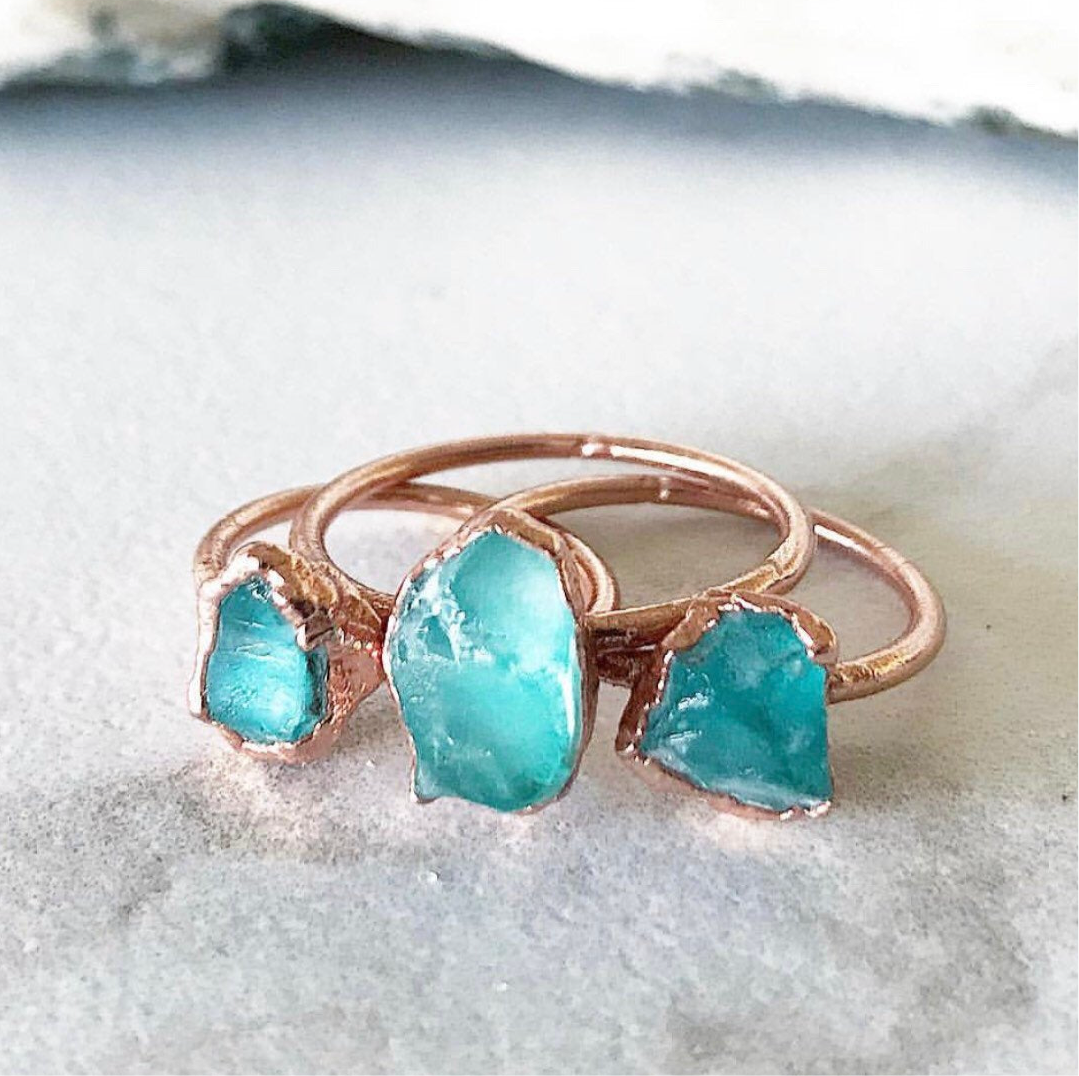 Raw blue apatite stones are electroformed with pure copper, creating the perfect everyday ring with an edge.
