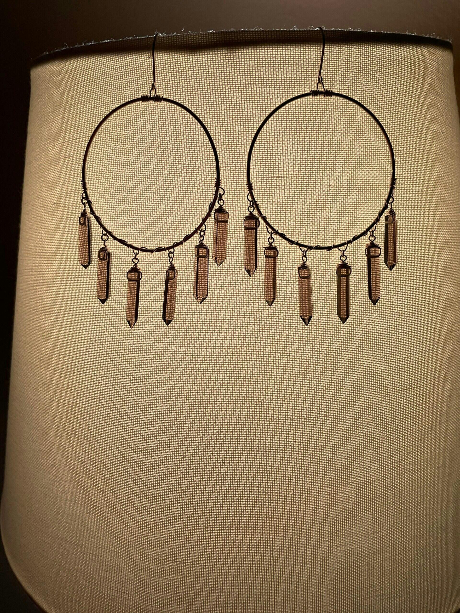 These luxurious chandelier hoop earrings come in your choice of 14k gold fill, 14k rose gold fill or sterling silver, and are adorned with 6 genuine crystal points.
