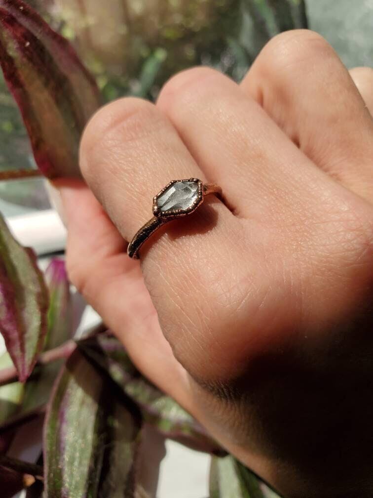 A raw Herkimer diamond is electroformed with pure copper, creating a unique ring with an organic style setting.
