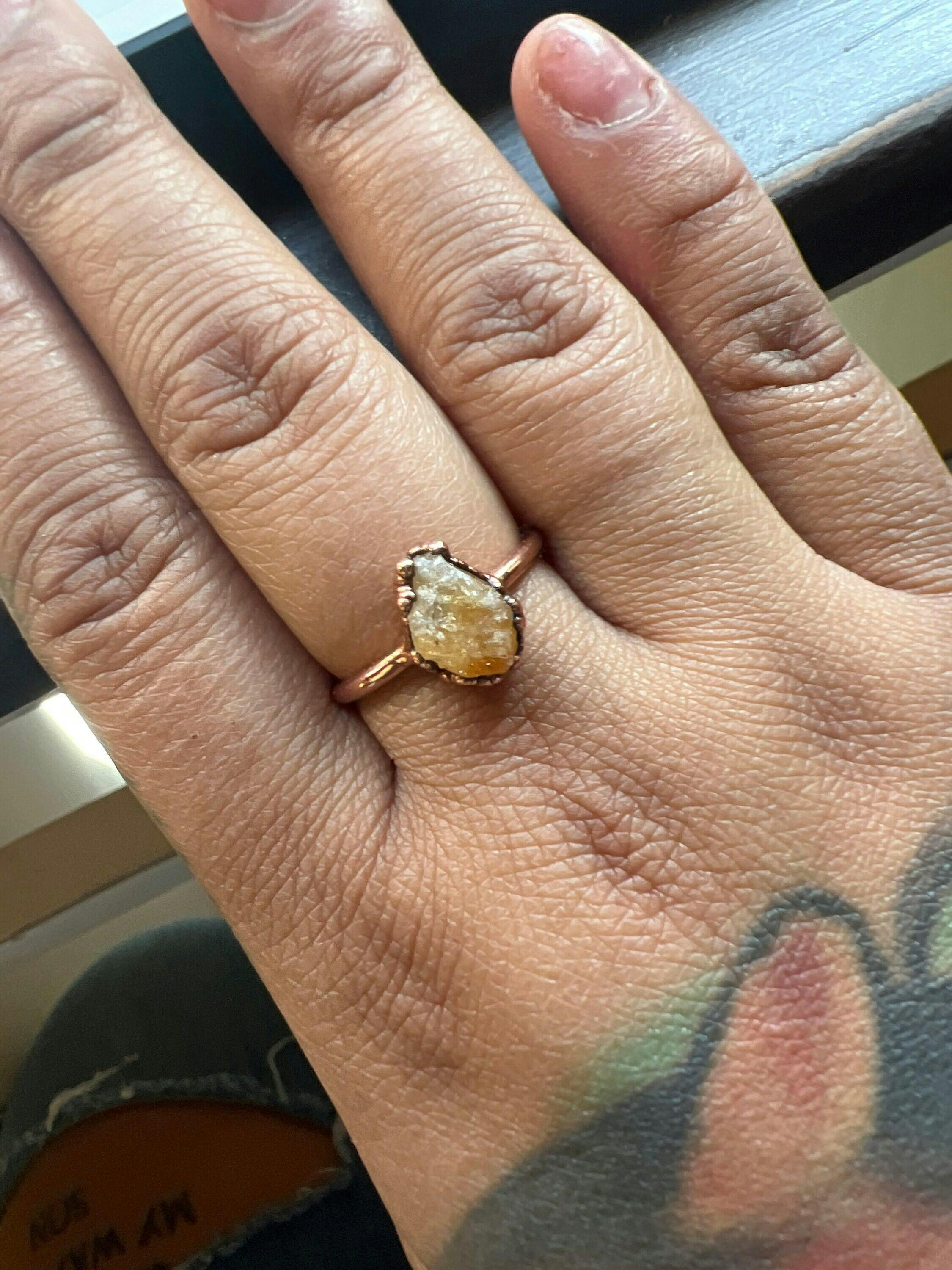 A tiny raw citrine crystal is electroformed with pure copper, creating a simple and dainty, everyday style stacking ring.