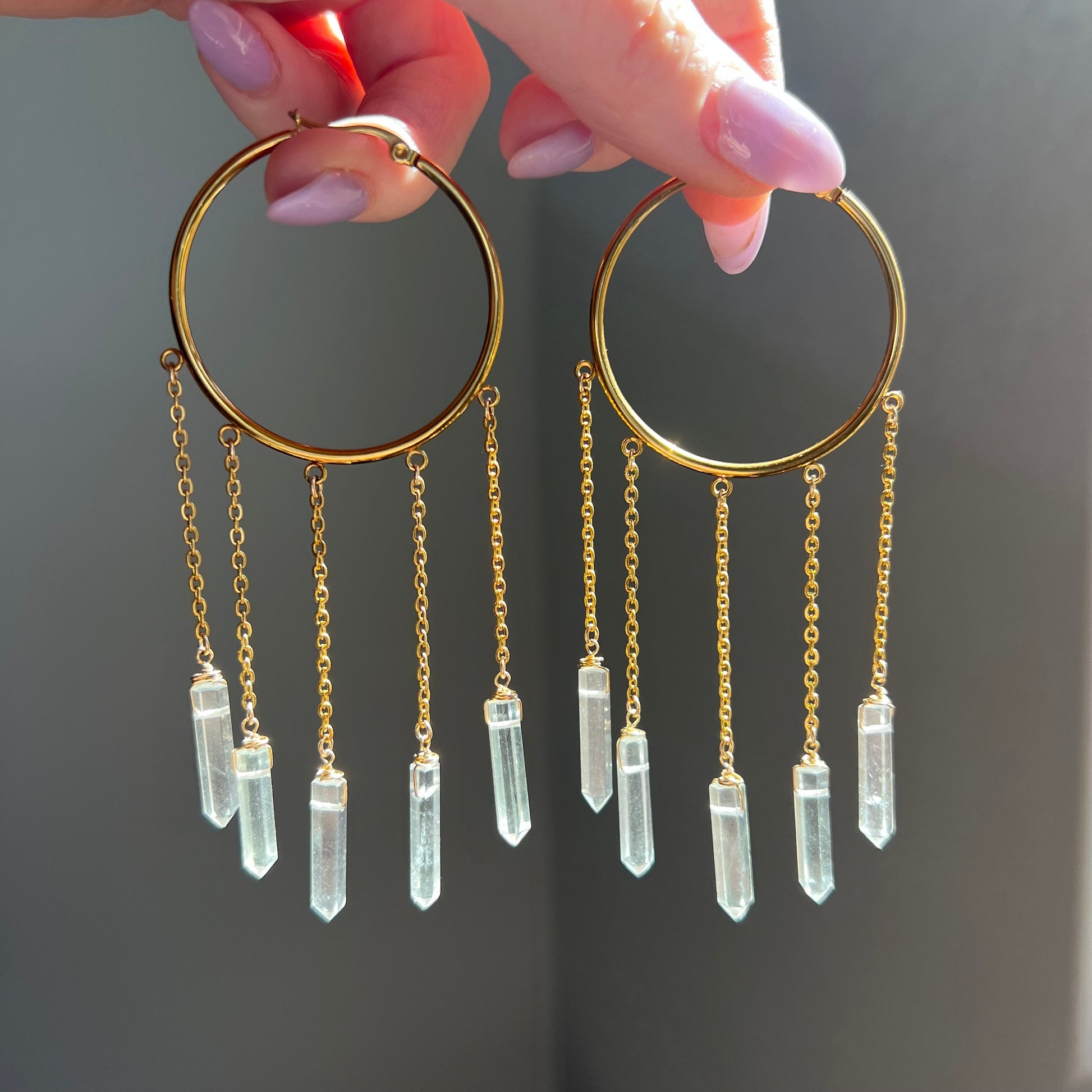 These dangling crystal fringe earrings come in your choice of gold or silver hoops and chain and are adorned with 5 cascading crystal points.