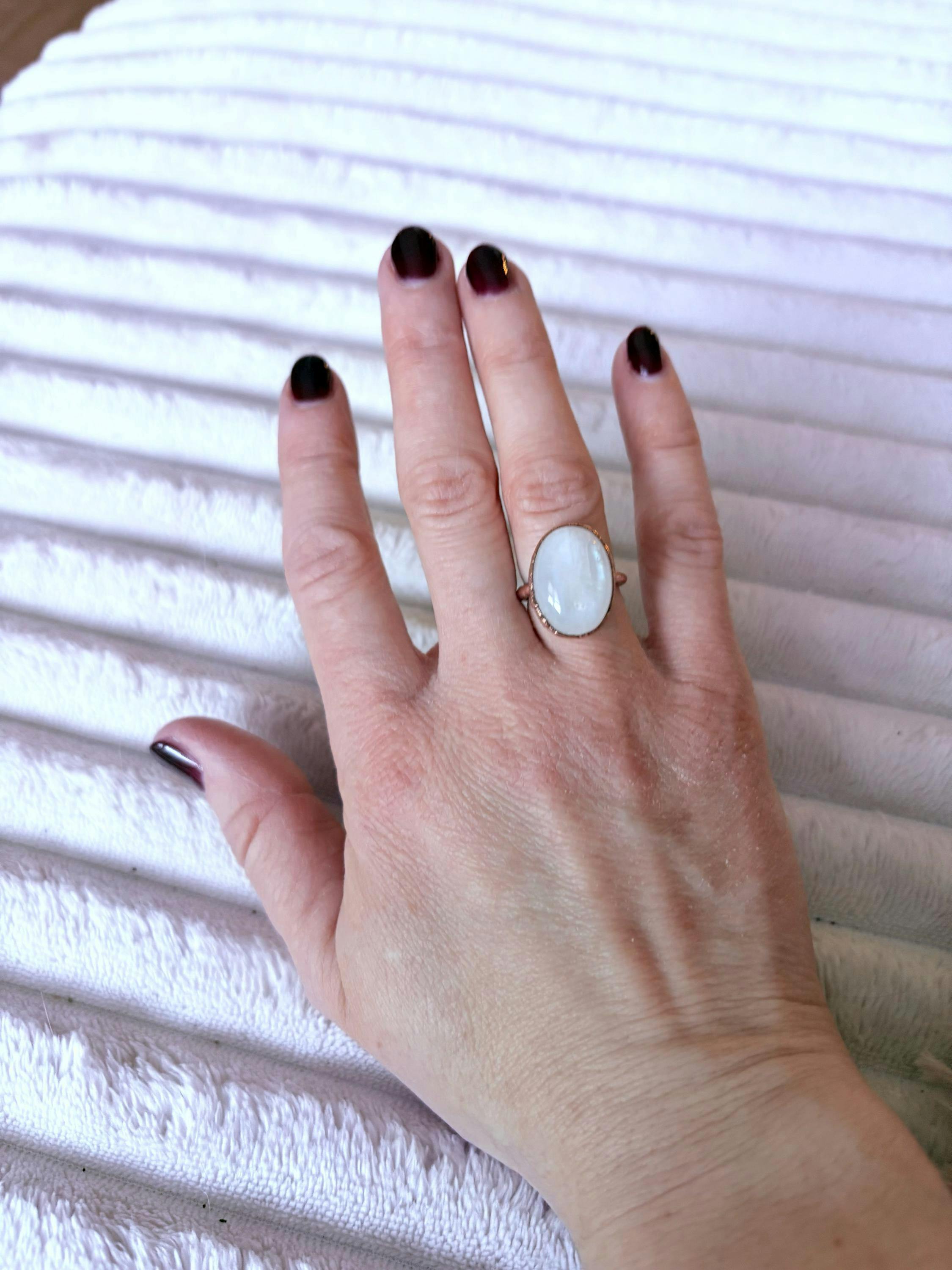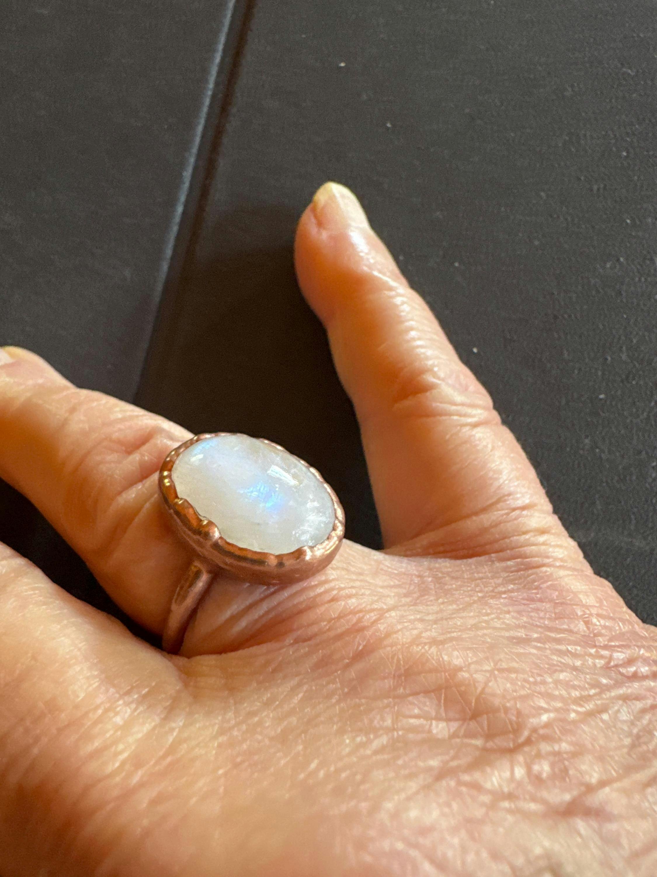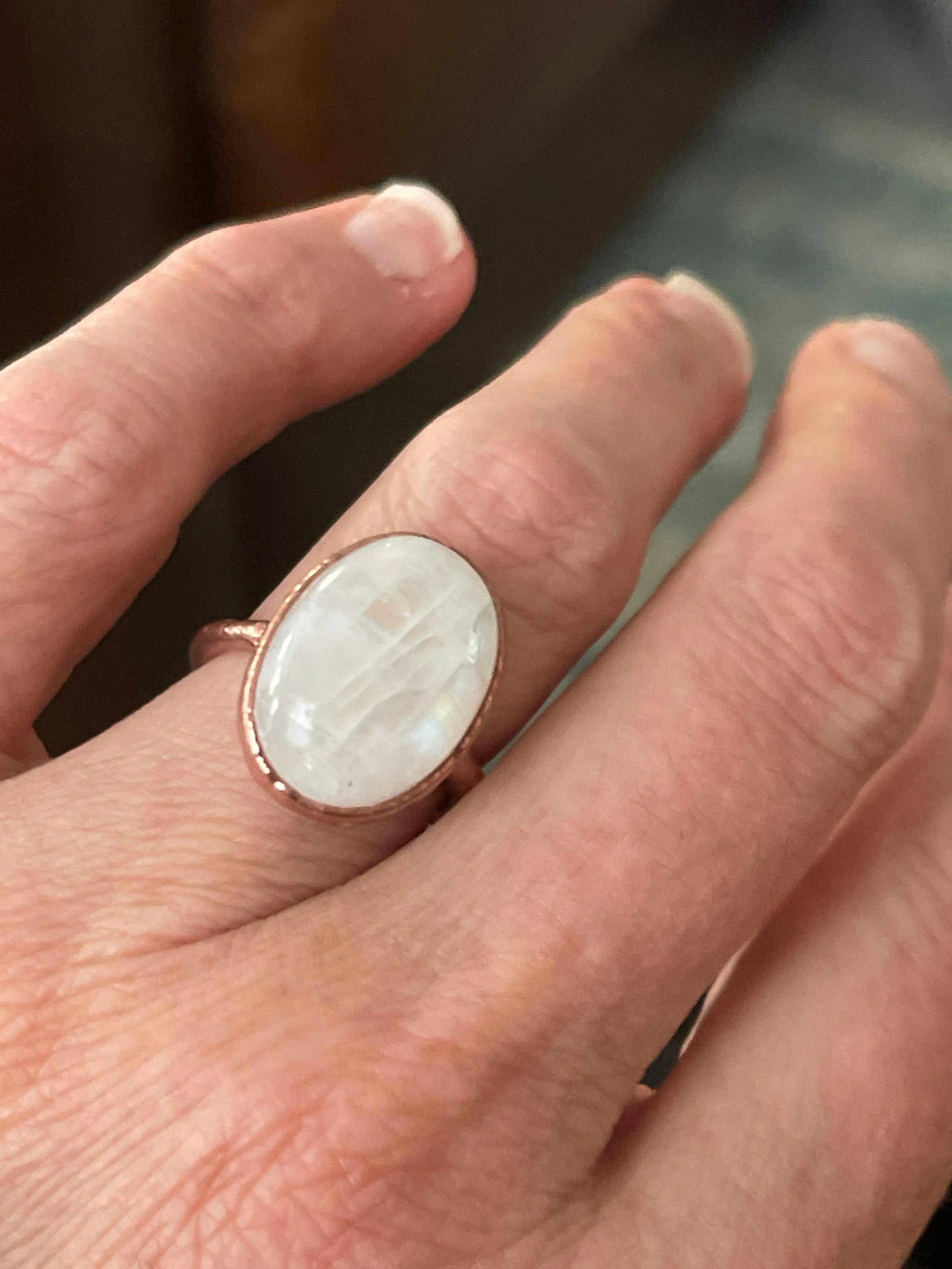 A polished moonstone oval is electroformed with pure copper, creating the perfect everyday ring with an edge.