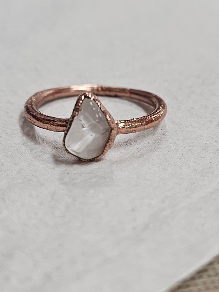 A smooth, polished crystal quartz gem is electroformed with pure copper, creating the perfect, organic style everyday ring. Crystal quartz is known as the "Master Healer", it is the perfect pick for anyone who is new to crystals and a staple for a crystal jewelry collection.