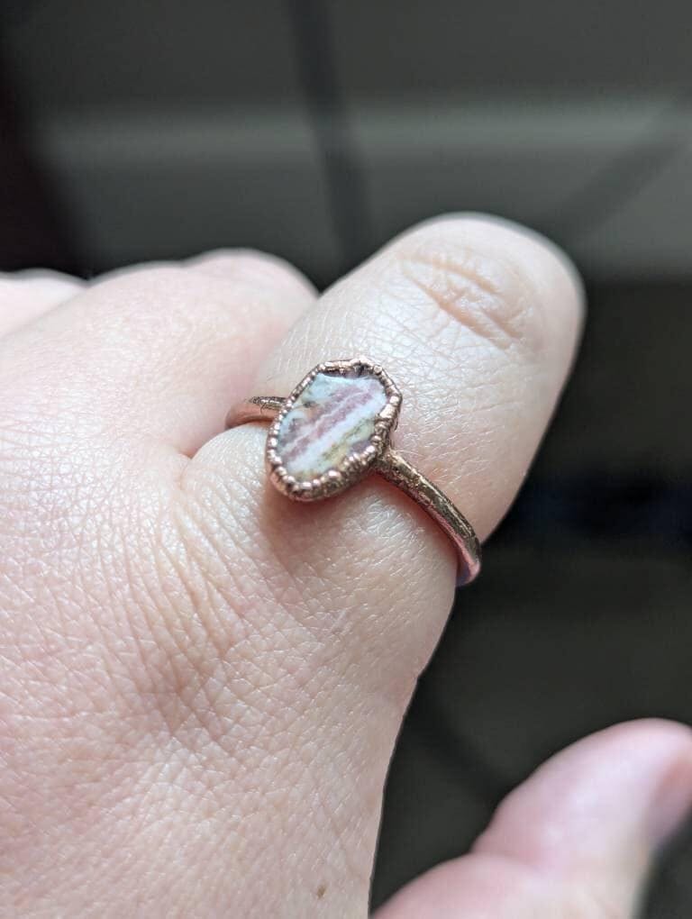 A polished rhodochrosite gem is electroformed with pure copper, creating the perfect everyday ring with an edge.